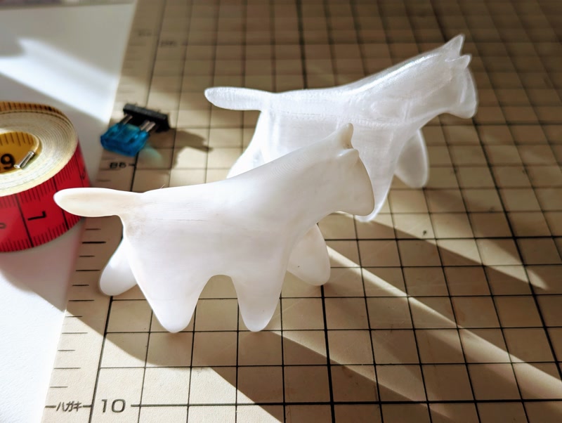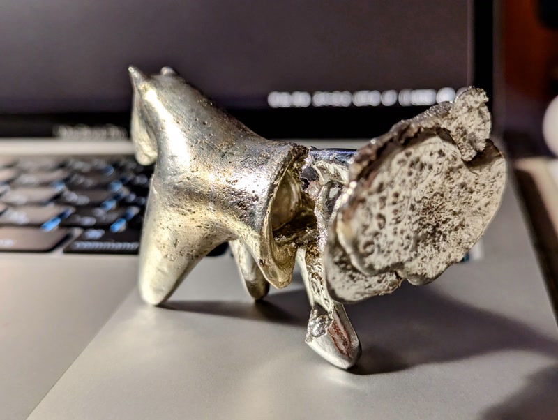 This is the result of trial and error, using a 3D printed prototype and a heat-resistant silicone mold to cast the tin. The spout placement was not ideal, so not enough metal flowed around it, leaving a cavity down the back leg.